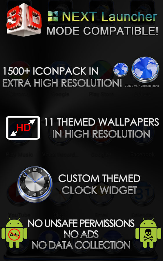 Ini adalah Tambahan Tema pada Next Launcher 3D. Bawaan Aplikasi Next Launcher 3D, rata-rata hanya ada 2 Teman bawaan, type Klasik dan Beta, untuk menambahkannya kita harus mendownloadnya, dan juga berbayar. Sekarang hadir Tema Keren untuk Next Launcher yakni Next Launcher Theme Techno 3D, yang sudah termasuk didalamnya 11 tema berkualitas High / tinggi, dan juga tambahan jenis icon 128x128 yang jumlahnya ada 1500 pack. so.... dengan tambahan Next Launcher Theme Techno 3D pada launcher Next 3D di perangkat android anda, menambah serta melengkapi gaya dan mempercantik tampilan perangkat android anda.
