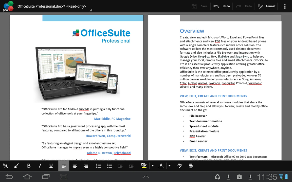 OfficeSuite Pro 7 (PDF & HD) adalah aplikasi Office yang membantu anda untuk membuat dokumen diperangkat android anda dalam bentuk format Document, Spreadsheet, Presentation, PDF dll, berikut adalah rinciannya: